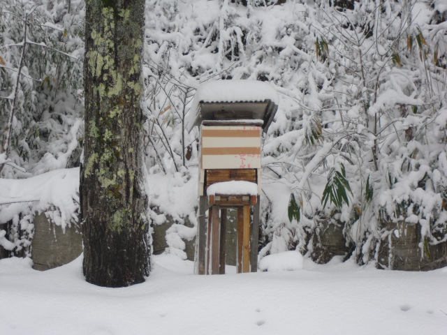 とうとう 積もりました。雪をかぶった 巣箱も イイ感じです。