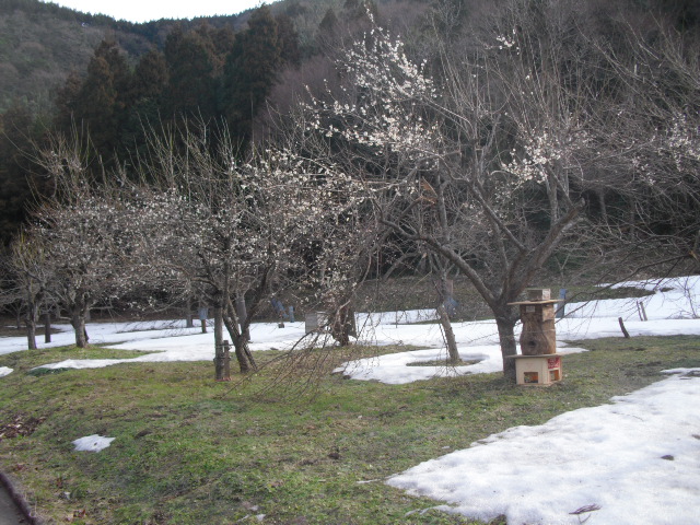 周りの 梅の花には蜂が沢山いて 両方の足に花粉をいっぱい付けています