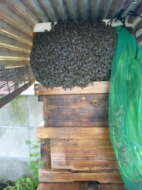 第3蜂場で分蜂、待ち箱に取りつきました。仕事中なのでそのままにしましたが夜はかなり冷えそうです、明日も7時から仕事なので自ら入って欲しいです。