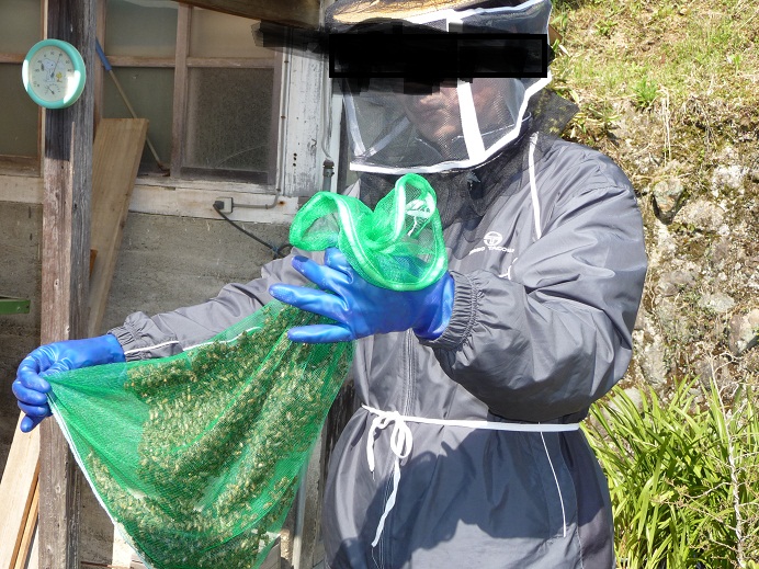いつもなら箱を下に置いて虫取り網で掬って入れて夜に箱を移動するのですが、今回は巣枠式巣箱に入れたかったので巣枠の入った巣箱をガタガタ持って帰るのをやめて玉ねぎネットで捕獲して300m離れた実家に持ち帰りました。巣枠を3枚外して上から投入しようとしても蜂は上に上る習性があるので入れることが出来ず(普通の袋なら滑って入るんですが玉ねぎネットは足がかりが良すぎで^^)、結局巣枠を全て入れて巣門入り口にネットの口を当てると5分程で全て吸い込まれて行きました(暗いとこがいいのでしょう)。
