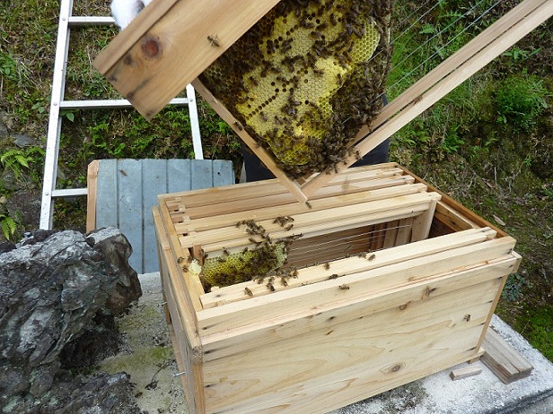 巣枠式では、箱の上蓋を開けて内検しますので、
