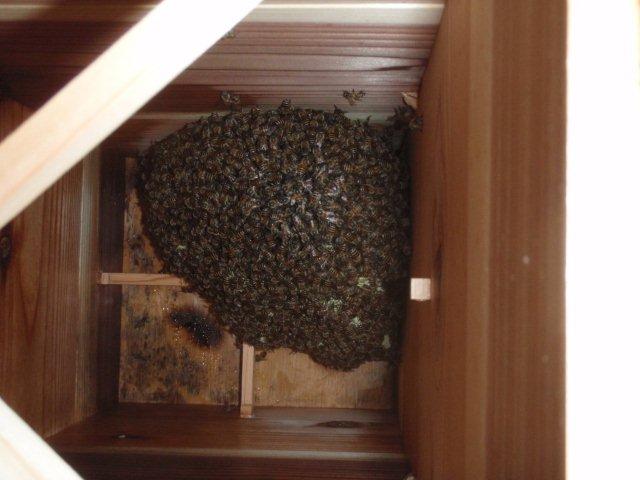 >トラさんが、初めて神社で捕獲した群で「トラ神社1号」柿の木の蜂球とりこみで「柿子」、変圧器の蜂球取り込みで「アツコ」、ちなみに待ち箱入居群は、「駅子」(私の実家を身内では、駅の家と言ってる)と命名しました。