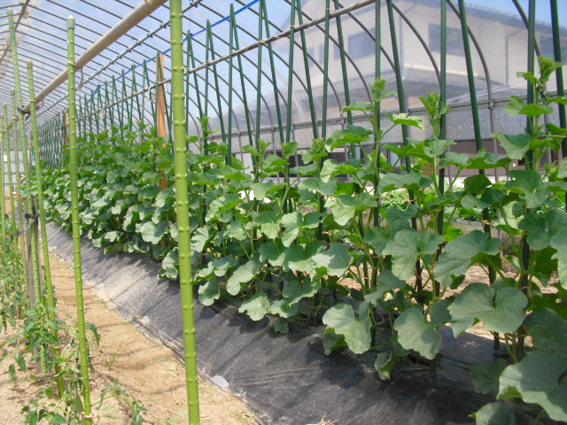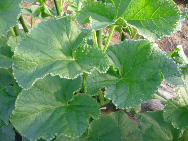 早朝のハウスの中の出来事です メロンの葉の周囲に露がついています。