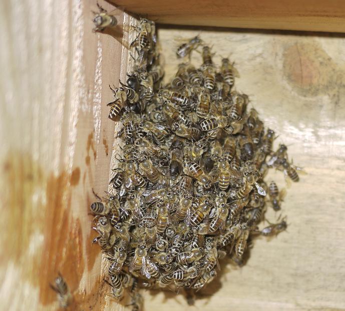 人工分蜂や、過去の移動では、本巣のあった箱に蜂球ができました。