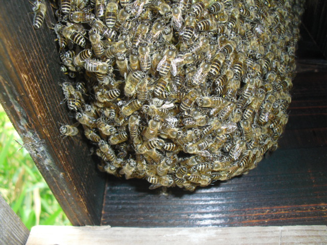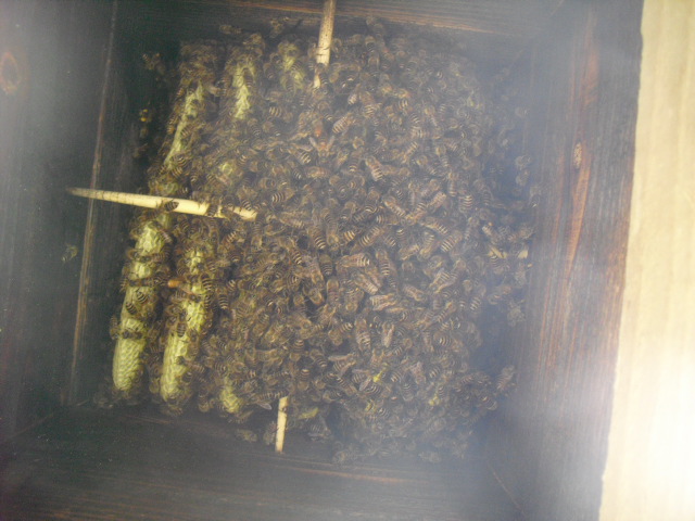 この郡は 自然巣からの分蜂郡です細長く巣を作っていますので 2段目まできています。
