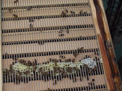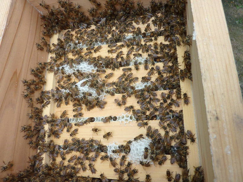 先週末に巣枠式群を見たのですが、一ヶ月放置していたため巣枠全てくっ付けてひとかたまり状態です。無理に取ろうとすると巣板が崩れそうでした(泣)さらに巣枠の上にもやや盛上げてます~^^