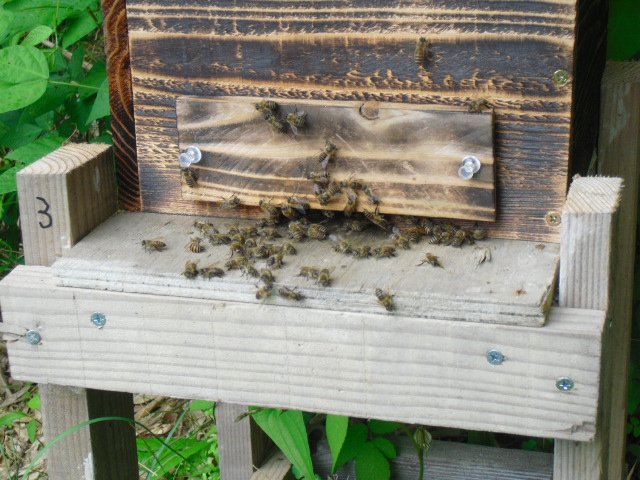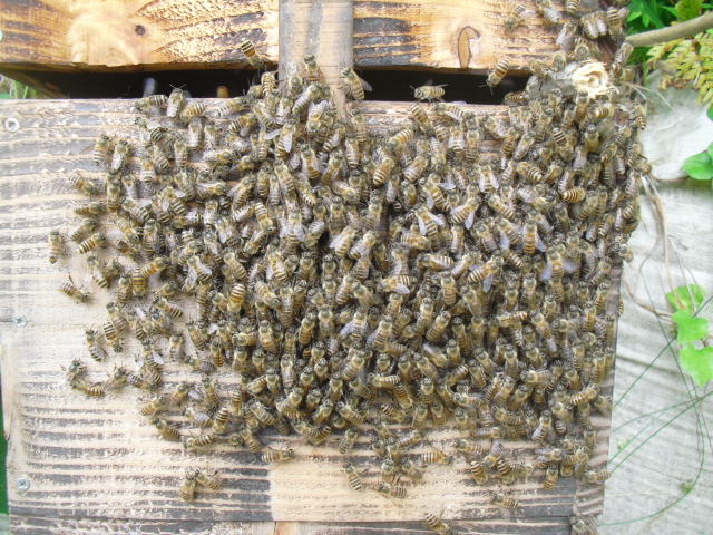 どの巣箱も賑やかい 特に第3分蜂郡は こんな状態です。