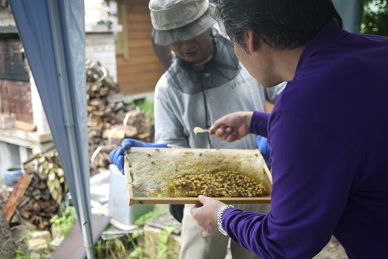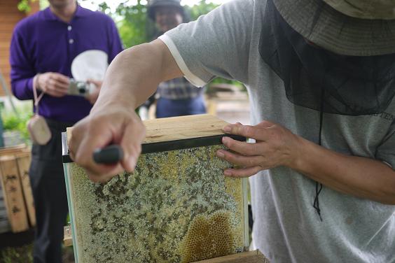 この画はスロー人さんが砂糖水給餌してミツバチが貯めた砂糖蜜の部分を試食しているところです。