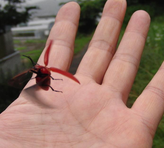 写真は、本日見つけた、超レアな真っ赤な甲虫です~(◎-◎)