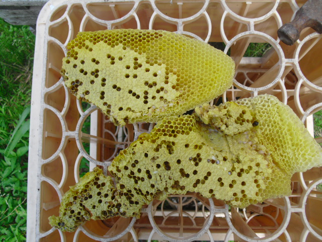 正解かどうかわかりませんが、落ちた巣板、巣箱の中に立てかけておけば、育児するし、蜜も食べますよ。