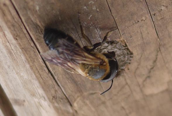 節穴を巣にして、泥で蓋をしています。