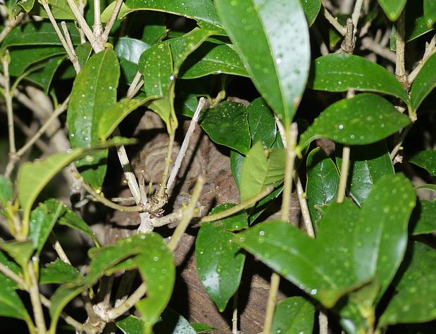 低いところの場合は、夜になったら風上からスプレー式の殺虫剤で駆除可能です。