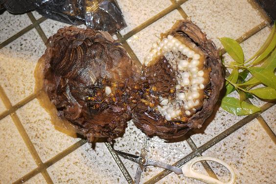 軒下に梯子を延ばして大きな袋を巣の下から被せて軒下の接着部分を鎌でザックリ~、袋の中でブンブン騒いでましたがそのまま持ち帰られたました。あの後どうしたんでしょう?