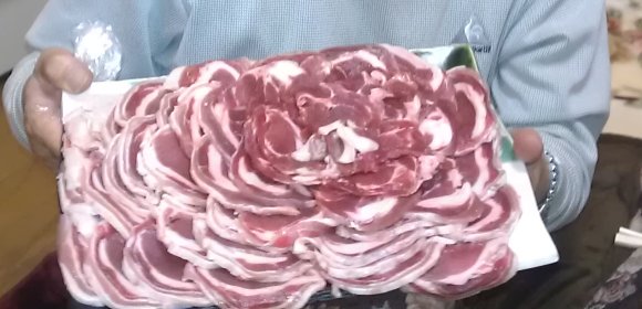 ボタン肉がきれいにスライスされていますね。檻の中の猪はまだ若そうですね。ちょっとかわいそう・・・餌をやって大きく育てたらいかがでしょう。