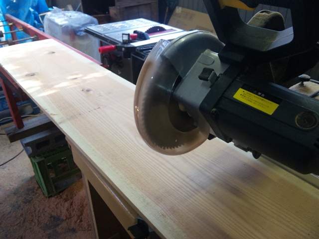 底板の暫定カットです、後でテーブルソーで整形しますが今回も奮発して底板と天板は一枚板にしました。それにしても巾のひろい板は高価ですね。