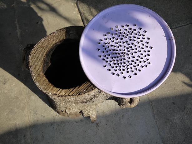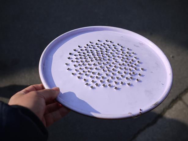 写真は、上に蓋をおいていますが、下に敷きます。穴の意味は、ゴミが下に落ちるが、スズメバチは入ってこられないサイズです。