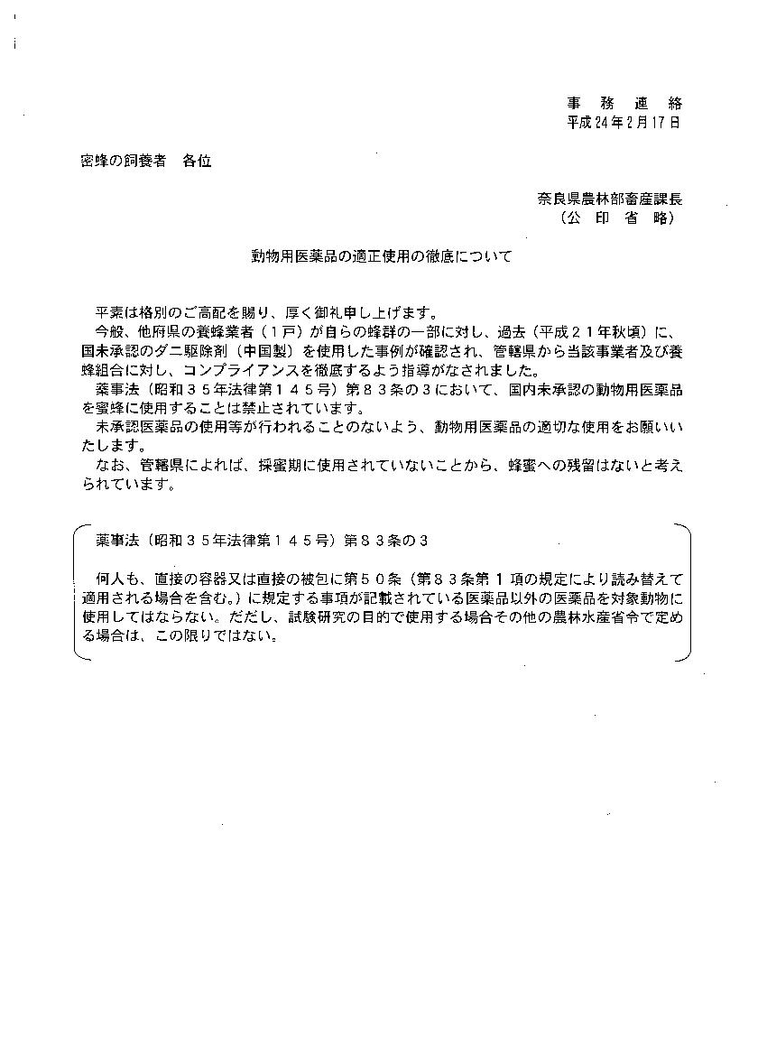 蜜蜂の飼育者 各位 by 奈良すずめ · 2012年2月18日 蜜蜂の飼育者 各位 投稿者:奈良すずめ 投稿日:2012/02/18(Sat) 19:06 No.144 本日、奈良県農林部畜産さんから郵便物がとどきました。 国未承認のダニ駆除材(中国製)を使用しりしないようにとのことでした。 郵便物の画像を撮りましたのでUPします。 シェアする
