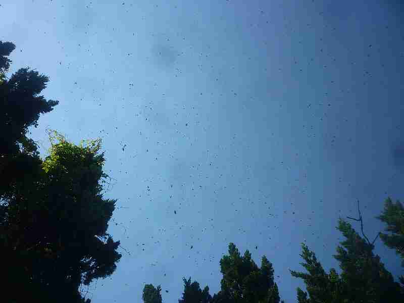 びっくりして探すと、3mくらい先のイブキの枝に蜂球が付き、その蜂球が飛び立つ瞬間でした。