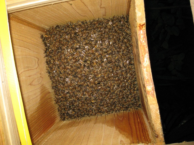 落とした分蜂群の新巣の柔らかさと格闘して、