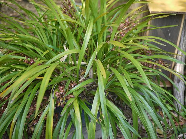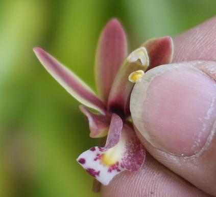 気が付いたのですが、探索蜂が背中に花粉を背負っています。きっとこのキンリョウヘンの花粉ですね。爪で引っかくと、こんな感じで花粉がはずれました。