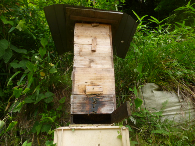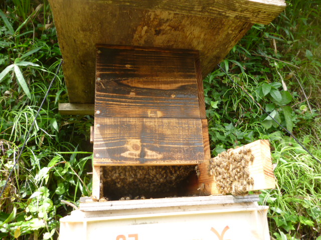 ワイルドだろ~!ですが たぶん2段採蜜して 巣門箱に落下防止棒を刺す事になるでしょう