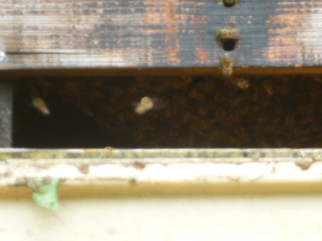 ①の今日の様子は 蜂が巣門の外に30匹くらい群がっています。