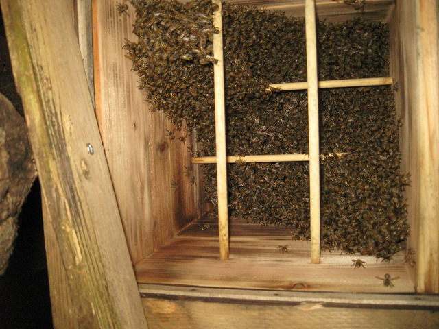 それかもしれません。それだと、僕の近所の蜂とは血統がおそらく違います。そのせいかこの蜂場5箱置いてるのも関わらず、その中の巣箱に入居しました。他の群の2mも離れていない場所です。(いよかんさんすいません。実をいうと今年はもう入らないと思って、巣箱そのままにしていました)