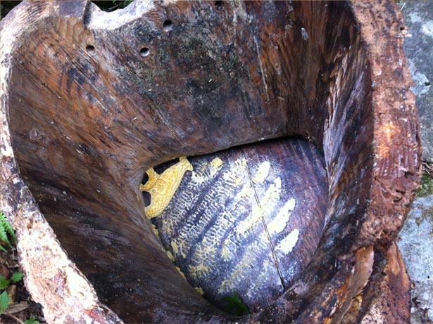 せっかくなので(事ある毎に熱く語ってますが)ちょっと補足させていただきます。丸胴に巻いてあるのは電柱に巻いているアレです。これをワイヤーで近くの木につなげております。熊は蜜の貯まった丸胴を見つけると気持ちよくぶっ倒して、その場だったり少し離れた場所で丸胴を割って綺麗に巣ごと食べるようです。亡き師匠は「中身は元々熊のものだから仕方ないが、丸胴は返してもらう。熊にやられた丸胴は箔が付ついて次の年にまた蜂が入る。」とよく言ってました。はっきり足跡や毛やかじった後がある時は良いのですが、正直ちょっと怪しい時もあります。師匠はキッパリ全部熊!としてましたが…。割られ防止とワイヤーはたぶん師匠のオリジナルのアイデアだと思いますが、皆さんは全く必要なさそうですね。奈良県の南の奥山で蜂をしている人は特に熊対策はせず、やられる前に移動するくらいです。