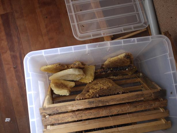 私の方は、イノシシ被害の転倒巣箱を巣枠に移そうと