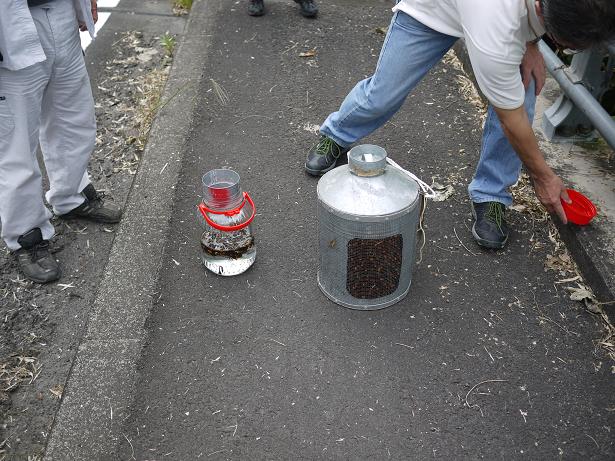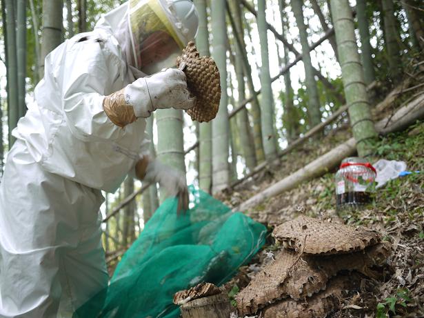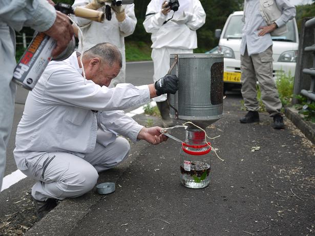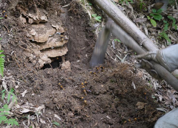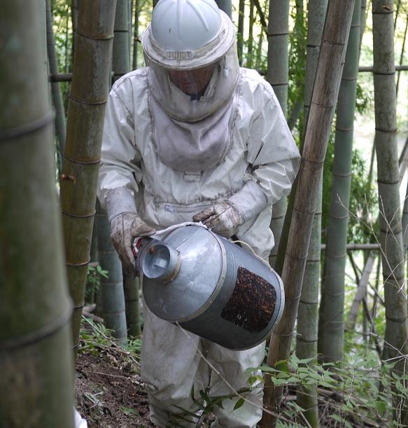 この道具をオオスズメバチの巣の入り口に押し込んでいると、