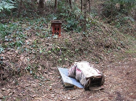 先日蜂場に行きましたら、巣箱が1つ斜面を転がり落ちて解放巣のような状態になっていました。
