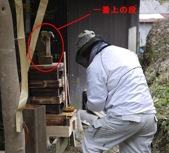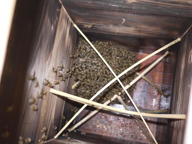 ですから、この巣箱には、もう一段上の箱があります。最初の下から覗いた写真は、二段目まであふれた状態で、一番上は満杯になっているとようです。繰り返し給仕していただいたので、とても元気です。