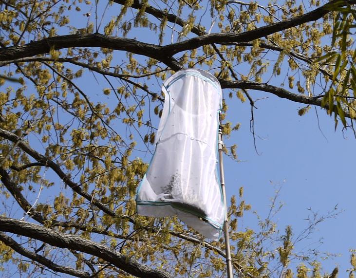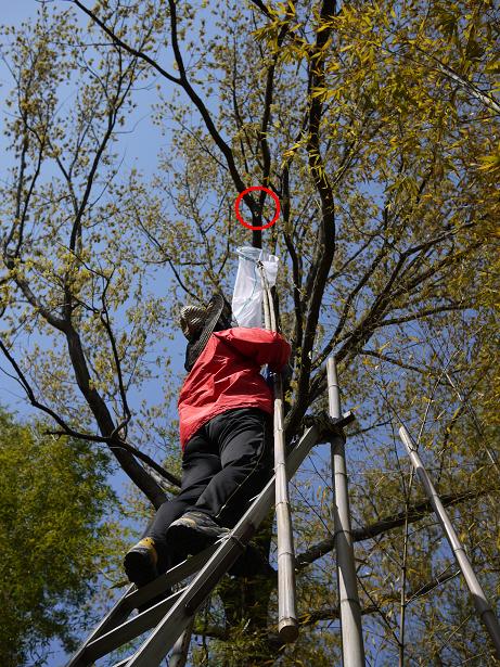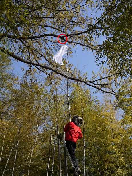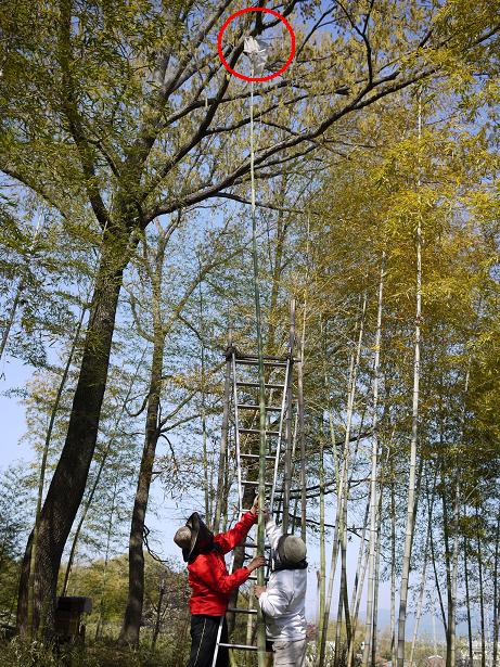 竹に縛り付けたハシゴから、更に長い補虫網での捕獲です。