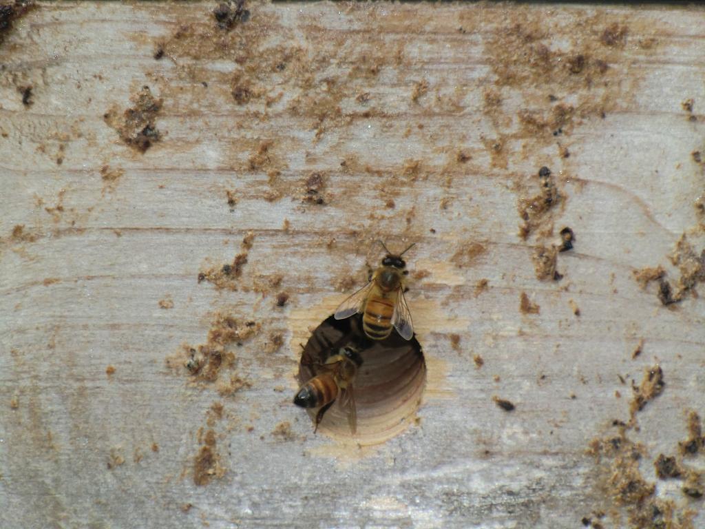びっくりした蜂が奥の方に逃げ込んで巣の状態がよく見えます。