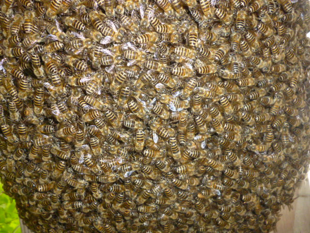 しかし、女王蜂がいる群れが水平に近い充分に広さがある板に蜂球をつくったら、もっと半球に近い状態になると思います。