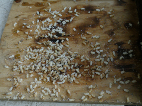 現在9群いる中で、1群ですが激しく子捨てがあります。現在の環境は、孫分蜂群です。自宅の犬走りの縁台にのせてあります。向きは北向きです。毎日内検をしていますが、21日と23日に底板一杯のこのような状態です。この箱だけ独特な香りがします。ある養蜂場では強酸水がいいとありましたので、明日これが届きますので早速トライをして見ます。