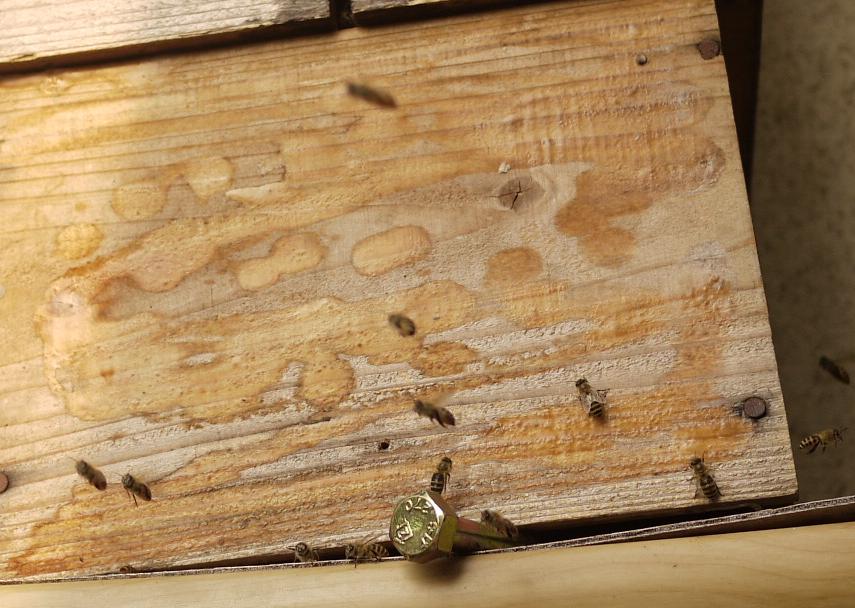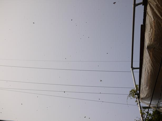 夏の蜂は落ち着きがないですね、本日私も箱から続々飛び出す時に遭遇しました。半数近く舞い上がっていましたが霧吹きが無く手持ちのペットボトルの水を口に含ませ巣門の蜂にかけたのが幸いしたのか舞いたった蜂雲が引き返してきました。この後はどうなるかまるでゲームです・・・