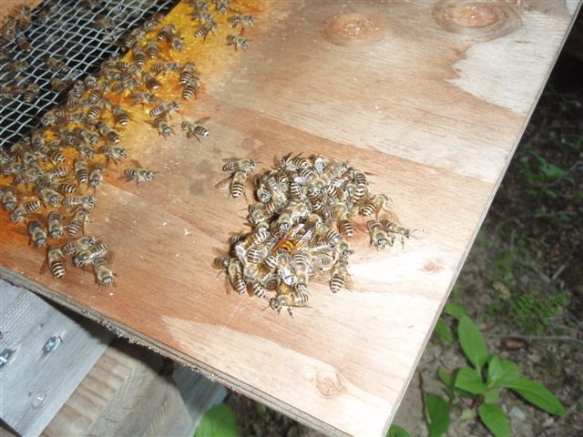 こんにちは、西洋は熱殺せず次々に顔を出してやられると聞きました。その為訓練で黄色すずめ蜂を捕らえると巣門の前へ差し出すと集まって熱殺をやる様になりました。