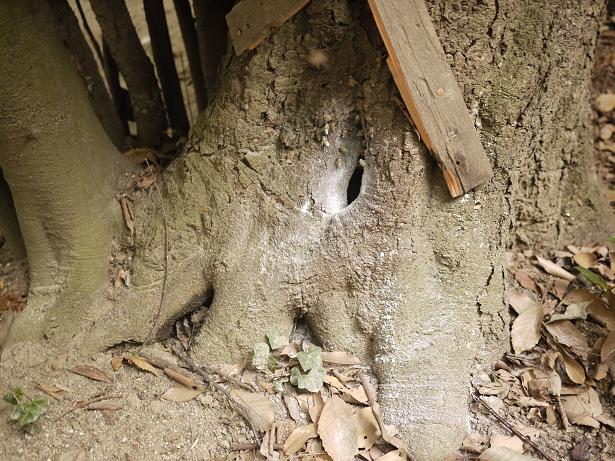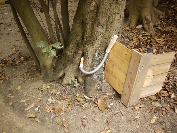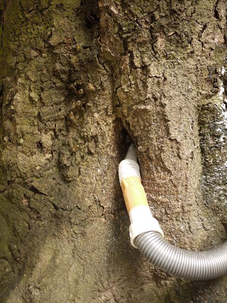 先週から一週間、昨日投入したのは木酢です。(注意)木酢は巨木を枯らすことがあるので要注意ですが、この木は空洞化しており、伐採予定になりそうです。