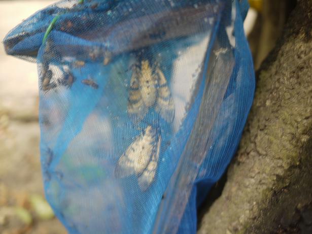 生憎の雨でしたから、蜜蜂は出ていません。替わりにメンガタスズメガが2匹でていました。こいつらは、日中は巣の中にいて夜に出てきたのでしょうね?
