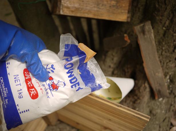 石灰を投入します。このあと送風機で風を送り巣を汚します。