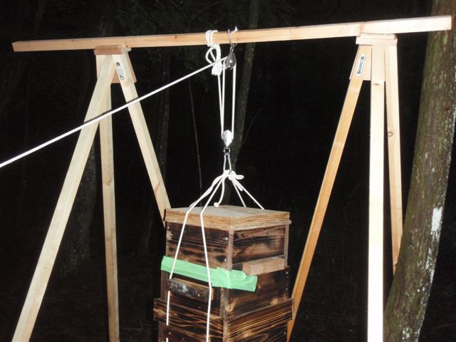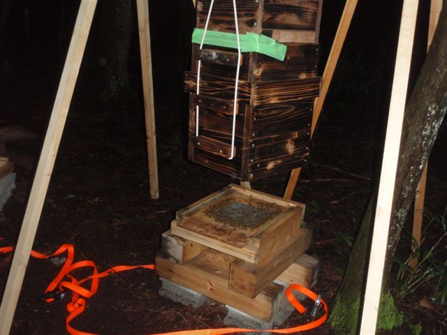 釣り上げ成功? by ギコギコとんぼ · 2013年9月1日 皆さんこんにちは!! 滑車での巣箱釣り上げ「やぐら」、ヤット自分では満足いく物が出来ました・・・。 31日に試運転をして来ましたから、写真アップします・・・。 一枚目は、全体の写真です。 モデルは、「長瀬一号」ですが、今年蜂玉捕獲をした群れで、強群では無かったのですが、一二を争う強群になり、五段目を(一段は150mm)追箱いたしました。 シェアする