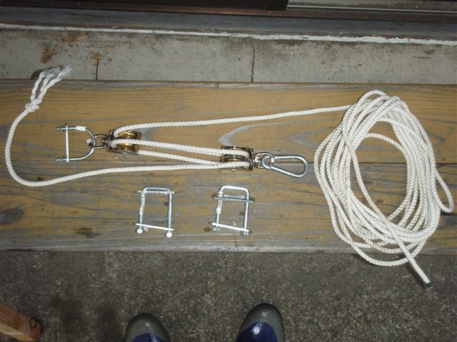 二連滑車ですから、ロープを引く力は、引き上げる重量の、1/4 になるそうです。
