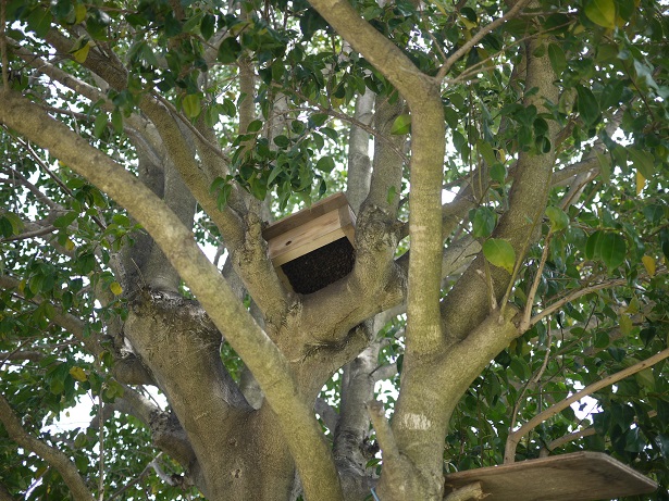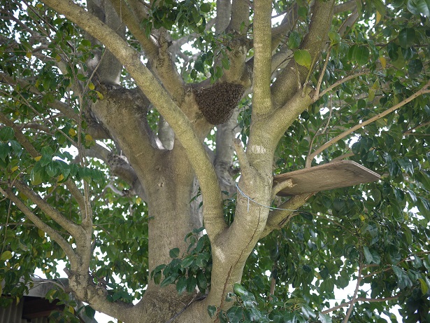 写真は近所の家庭菜園のモチノキに取り付いた分蜂です。
