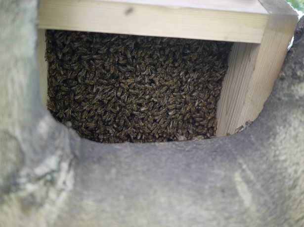 巣箱の表面に真っ黒な雄蜂が千匹くらい張り付き、