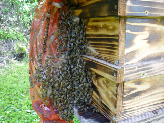 姉の屋敷内に置いている待ち箱に蜂の大群が来たとの知らせが姉から有り駆けつけてみると、すでに1部は入居して残りが巣門に入居中でした。