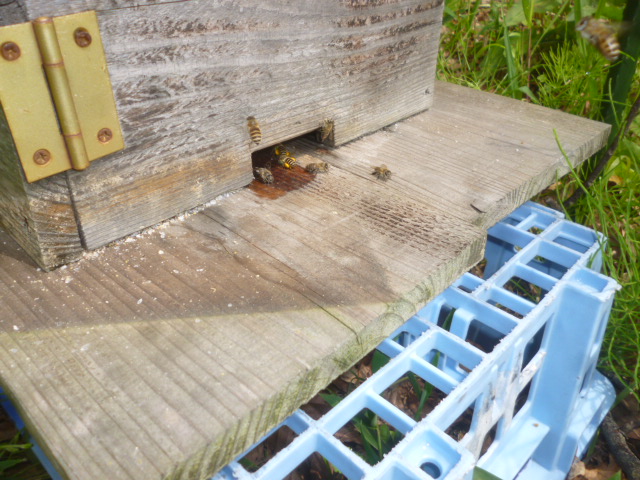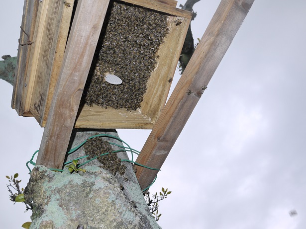 吸引剤を吊り下げた箱に花粉を運んでいる蜂が?
