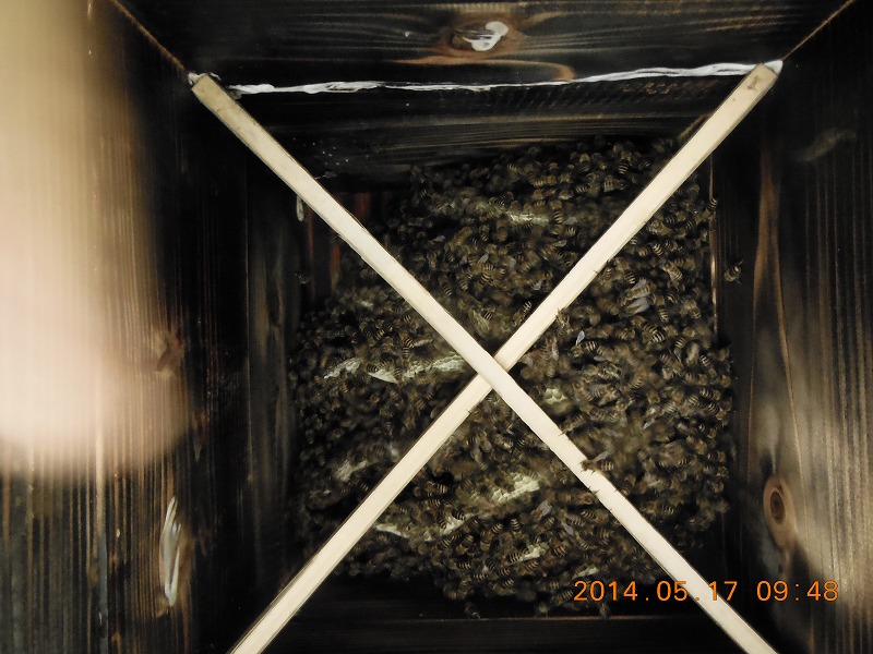 お蔭様で、走らず今年は6群入居、そのうちい1群ぎこぎこさん巣箱に。天板かどこか合板らしいな~と思いつつ、キンさんにくっついて外に営巣し始めていましたが、ひょっとして合板だから??
