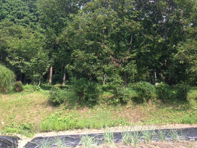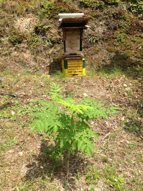 ご近所の私の弟子がこれまたご近所の方から蜂場の提供を受けたようです。こんな栗林が横に50m続きます。実家蜂場から直線で300m。キンリョウヘンで分蜂群をここに呼び込みましょうか。村のイベントになりそうです~^^