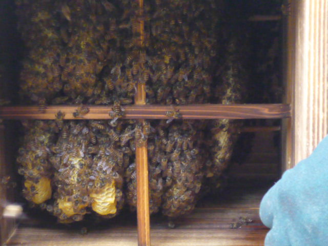 春の分蜂後に納骨堂より育児圏を貼り付けた重箱群は3段目の巣落ち防止棒まで巣素は伸びていました。
